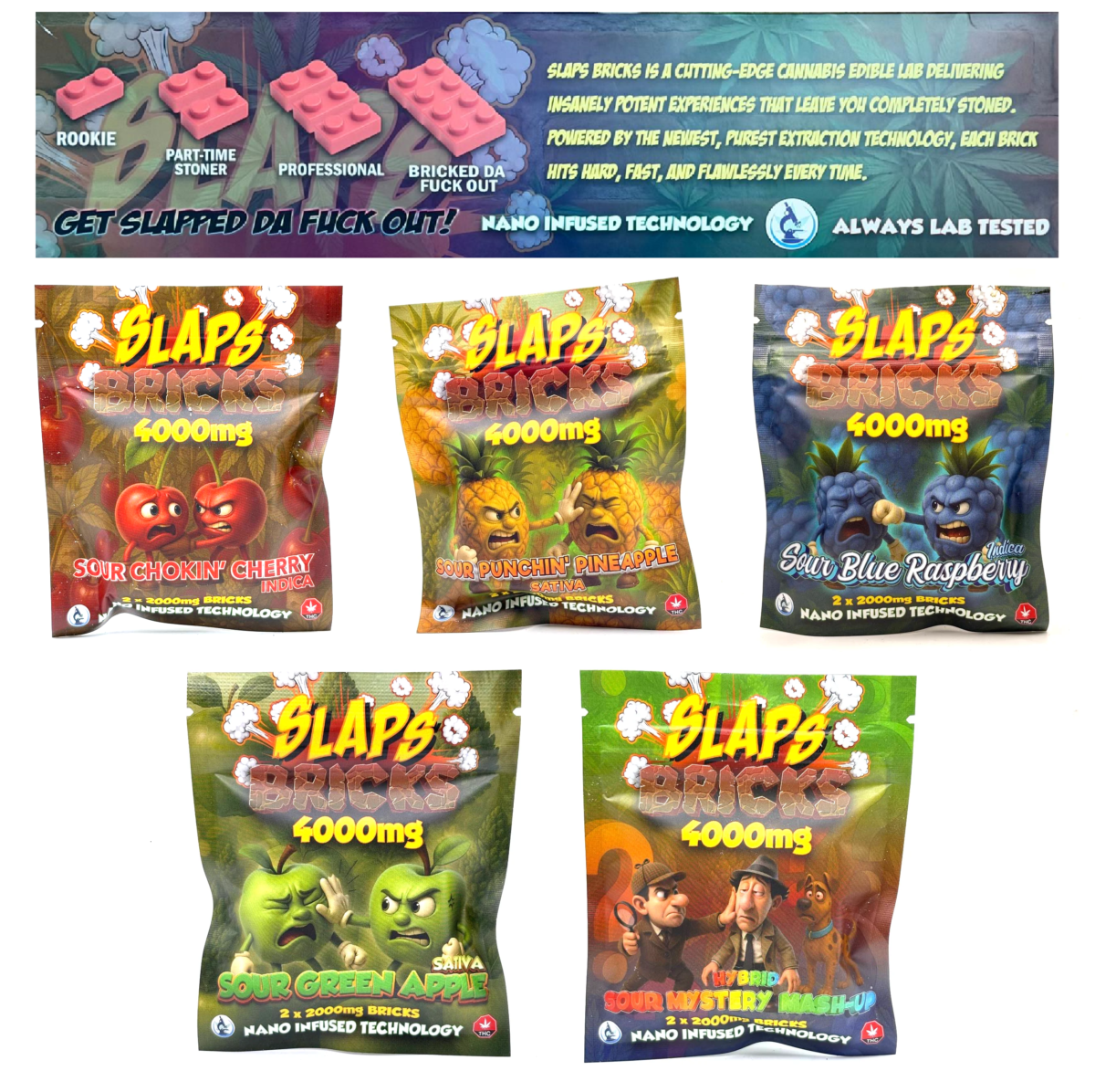 SLAPS Bricks by Hash Wars are cutting-edge cannabis edibles delivering insanely potent experiences that leave you completely stoned. Powered by the newest, purest extraction technology, each brick hits hard, fast and flawlessly every time. 2 pieces of cannabis-infused gummies totaling 4000mg of THC, each piece contains 2000mg of THC.